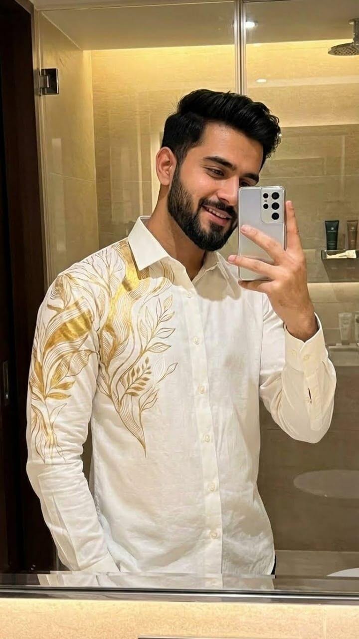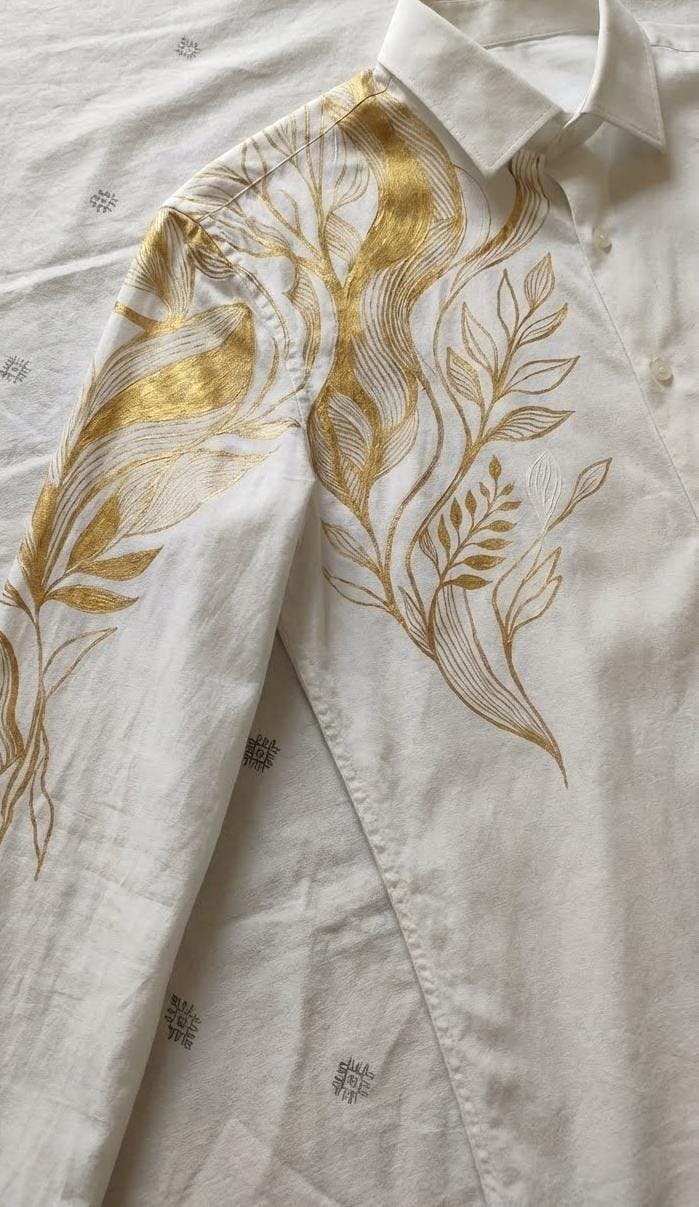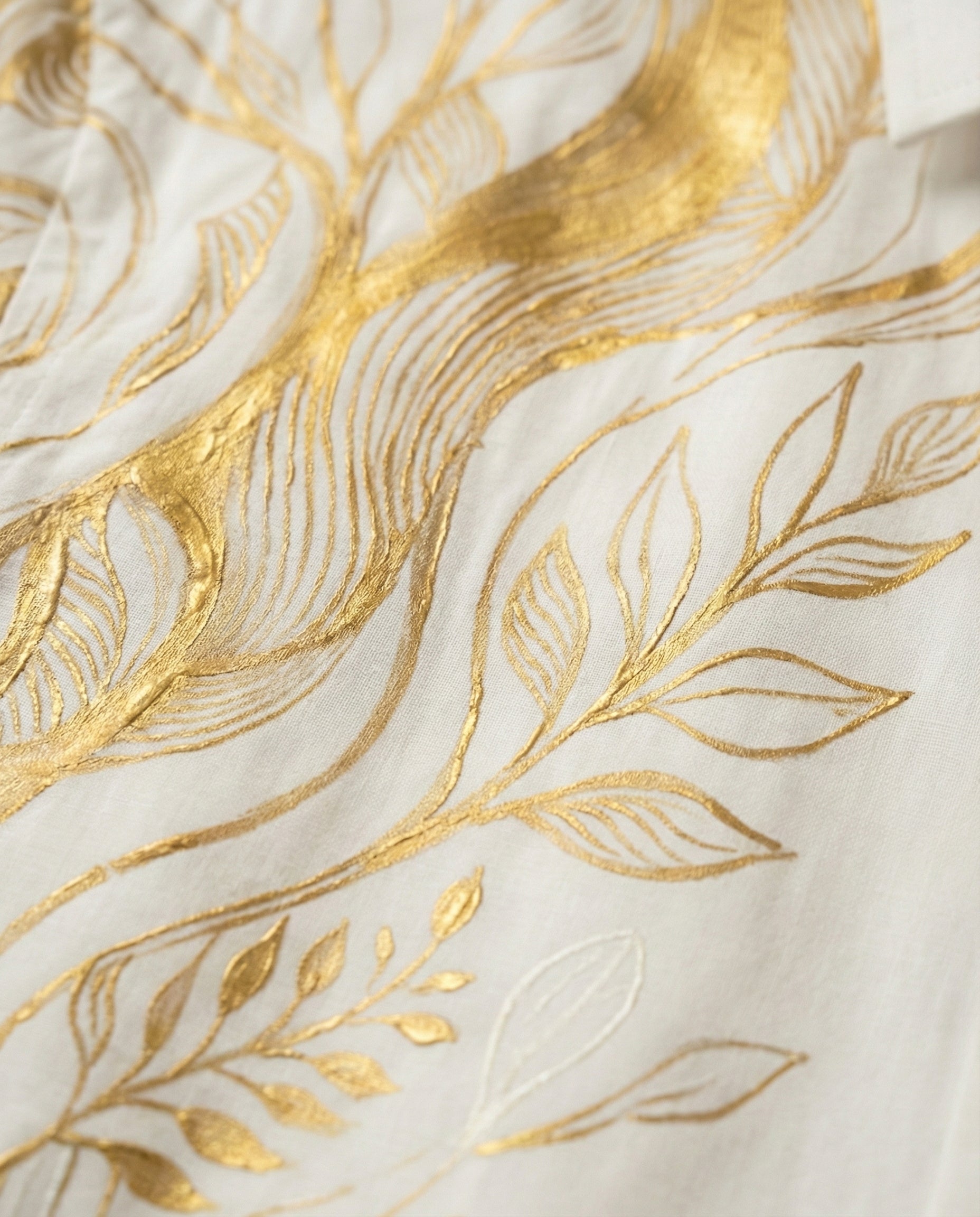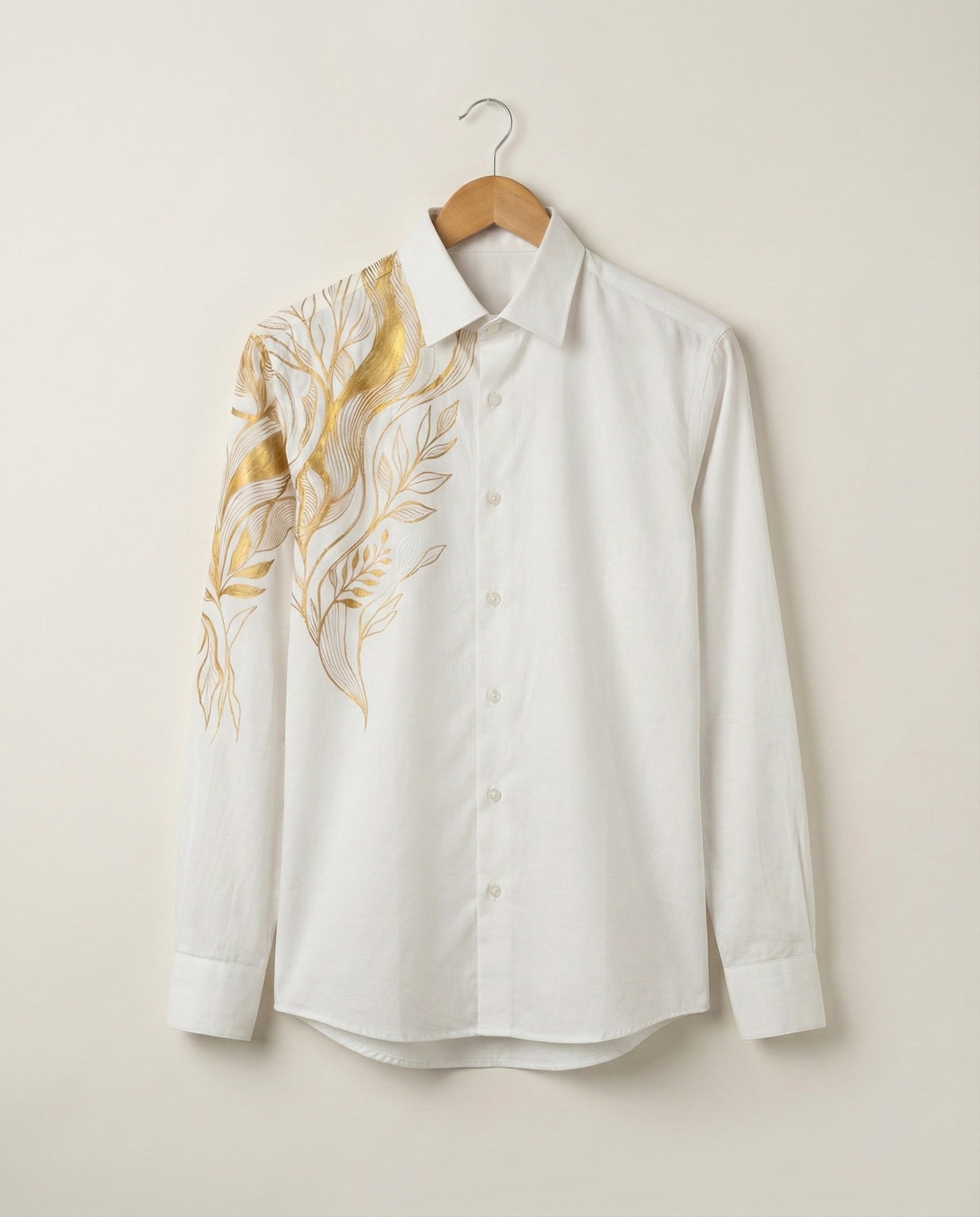 A regular-fit, long-sleeved luxury shirt handcrafted from Egyptian Giza Cotton Satin, renowned for its buttery softness, breathability, and rich sheen. The artwork features a hand-painted botanical composition of vines and leaves, rendered in warm gold tones and placed with balance across the shoulder and sleeve. The restrained layout enhances the silhouette while preserving elegance and wearability.