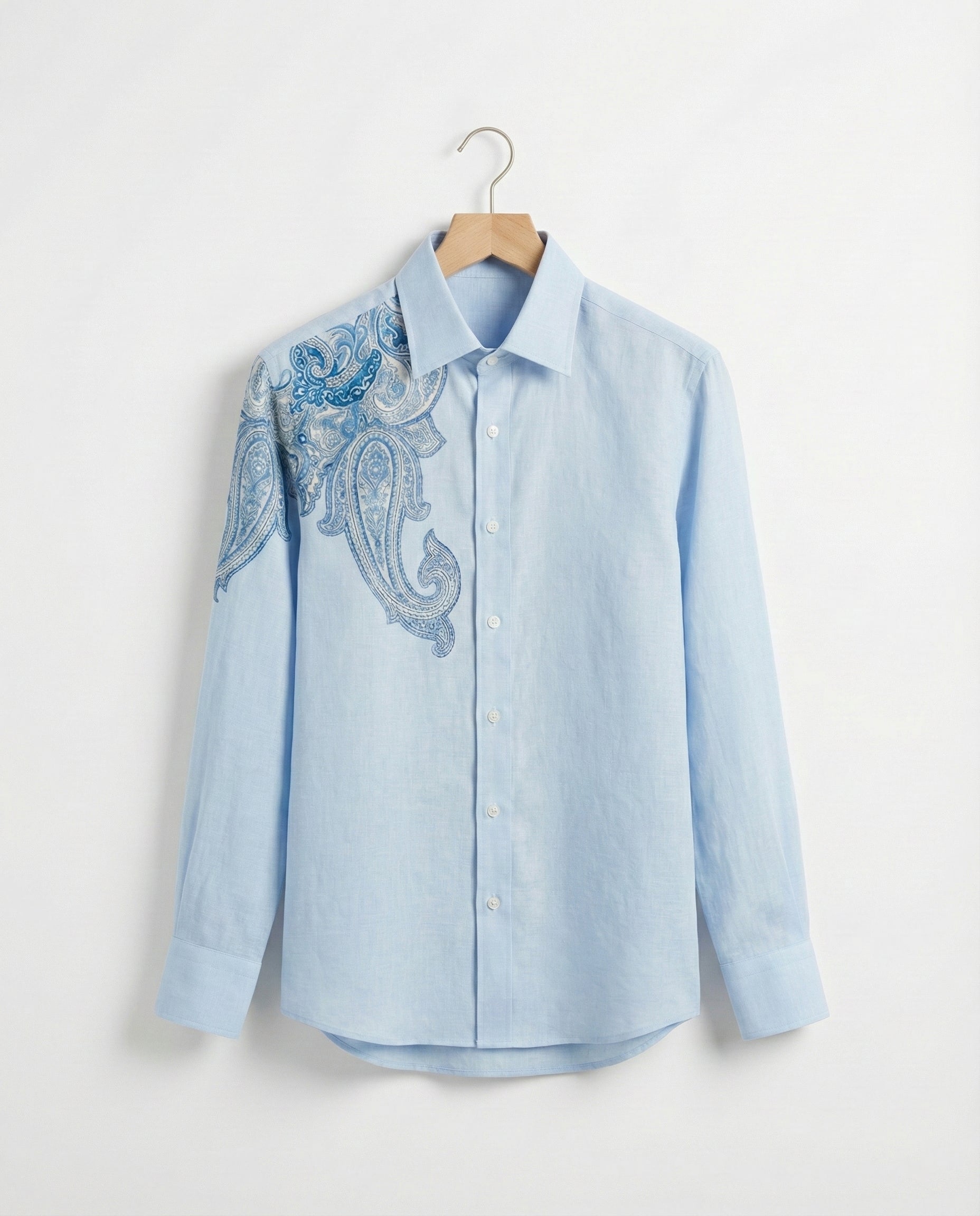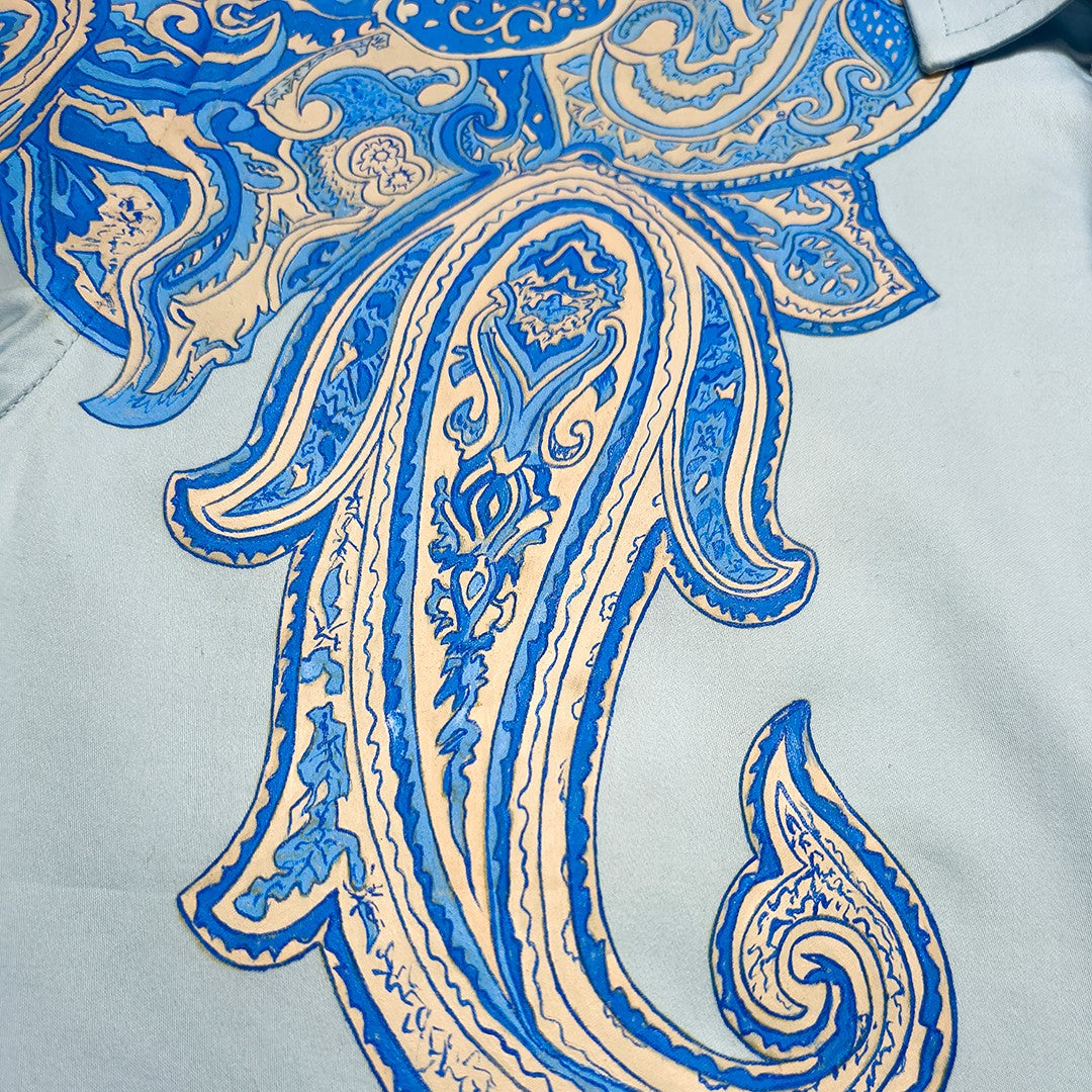 A regular-fit, long-sleeved luxury shirt handcrafted from Egyptian Giza Cotton Satin, renowned for its buttery softness, breathability, and rich sheen. The artwork features classic paisley motifs rendered with fine detailing and tonal layering, composed to flow gracefully across the shoulder and upper sleeve. The monochromatic blue palette enhances depth while preserving restraint, resulting in a refined silhouette that feels timeless and composed.