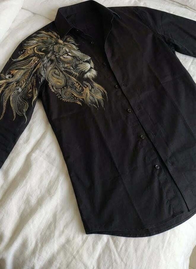 A regular-fit, long-sleeved luxury shirt handcrafted from Egyptian Giza Cotton Satin, renowned for its buttery softness, breathability, and rich sheen. The artwork features a hand-painted lion composition enriched with subtle ornamental detailing, positioned to command presence while maintaining balance and elegance. The black canvas amplifies depth and contrast, allowing the lion to project authority without aggression.